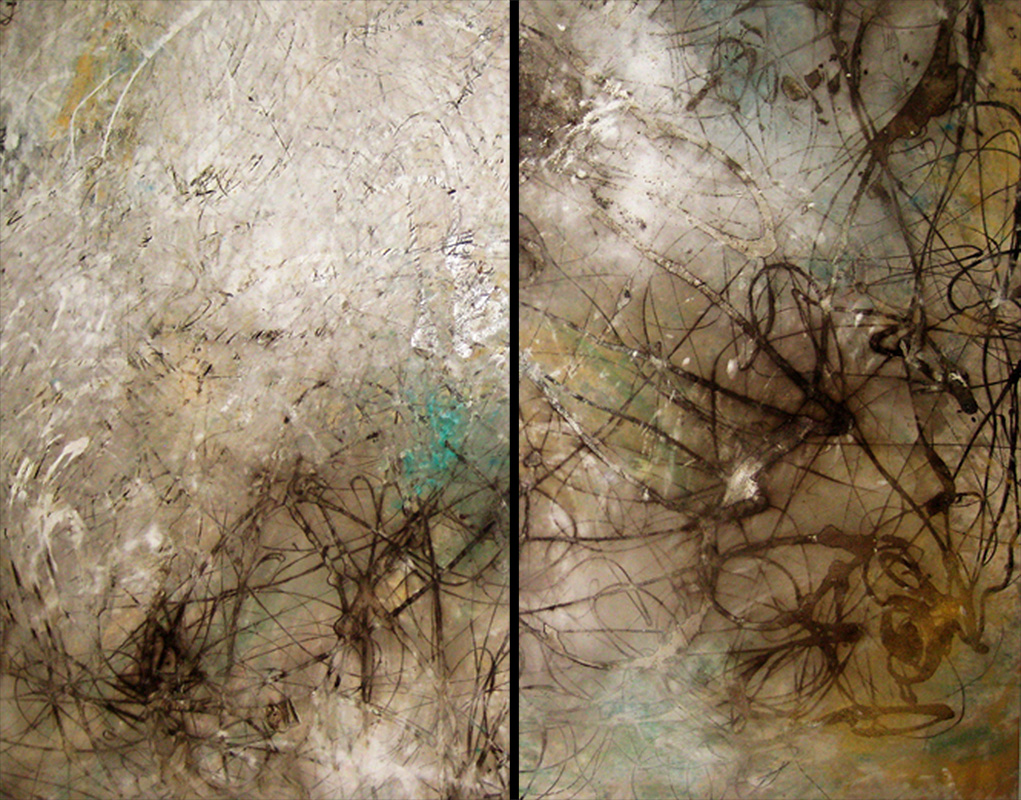 (september 2004)  Earth, charcoal, bitumen, wallpaint, crayon and oil on canvas 75x110cm each